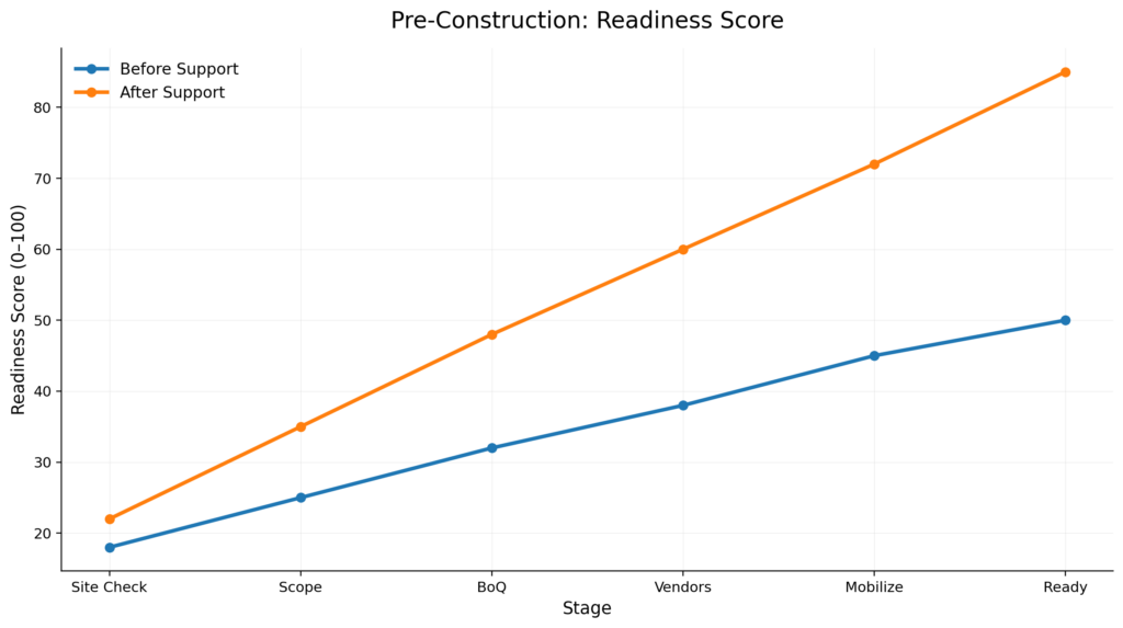 Pre-construction is where most delays begin – scope confusion, missing documents, unplanned approvals, or unclear responsibilities. We help you prepare the groundwork before execution starts by aligning planning, documentation readiness, design coordination needs, and timelines. This reduces rework and prevents last-minute changes that cost time and money.
